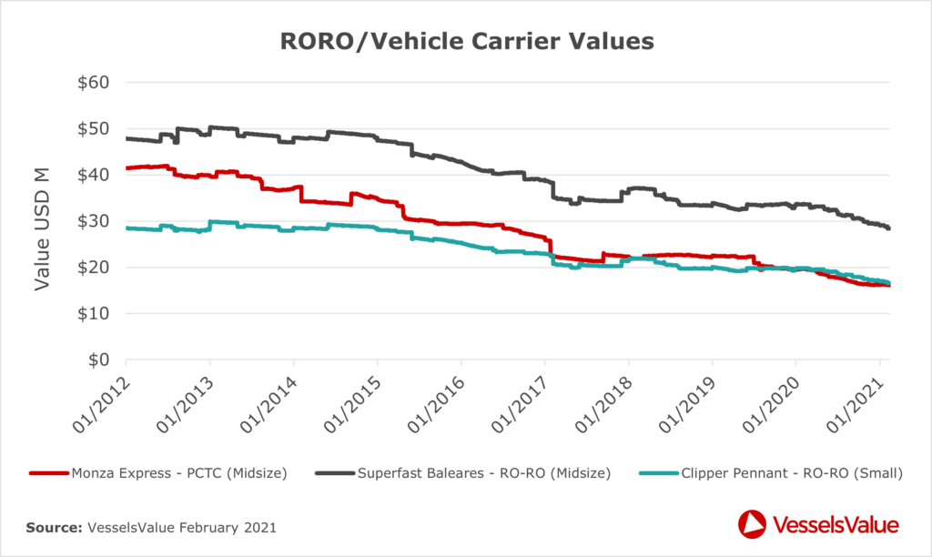 Figure 1. compares historical values for a Vehicle Carrier and two RoRos of similar age, tracking the PCTC-Midsize MONZA EXPRESS (3693ceu, 2009, Hyundai Mipo), the RoRo Midsize SUPERFAST BALEARES (3625lm, 2010, Navantia Carenas), and the RoRo-Small CLIPPER PENNANT (1830lm, 2009, Ast de Huelva) from the 1st of January 2012 until the 31st of January 2021. At VesselsValue, we track the daily value of a RoRo back to 2012.