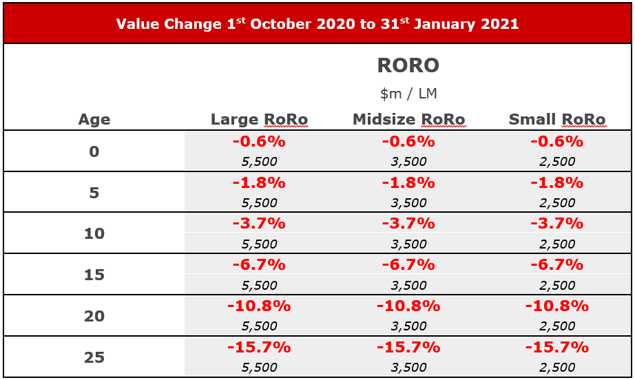 Based on the high proportion of valuable cars on LCTC/PCTC/PCC vessels, Vehicle Carriers will be the first type to go “green.” Closely followed by Ropax Ferries trading on shorter city to city journeys, where passenger income is the driver of earnings. Pure cargo RoRo vessels will enjoy the longest period of grace due to a more diverse cargo mix. The impact to values as non-green assets compete head on with green assets in respective markets is the big unknown. As per figure 2, RoRo values have been falling over the last four months primarily due to an oversupply. Government incentives to encourage scrapping could address this imbalance.
