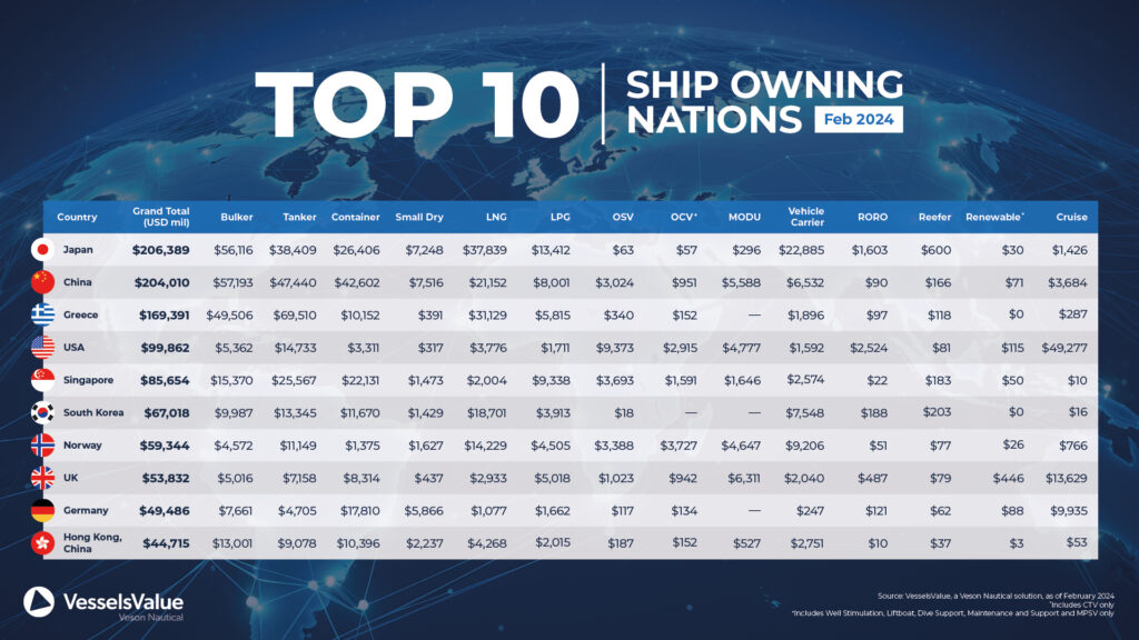 Please note that the data is valid as of February 2024. Total fleet values in the Top 10 shipowning nations and regions include the vessel types covered by VesselsValue: Bulker, Tanker, Container, Small Dry, LNG, LPG, OSV, OCV, MODU, Vehicle Carrier, Roro, Reefer, Renewable, Cruise.