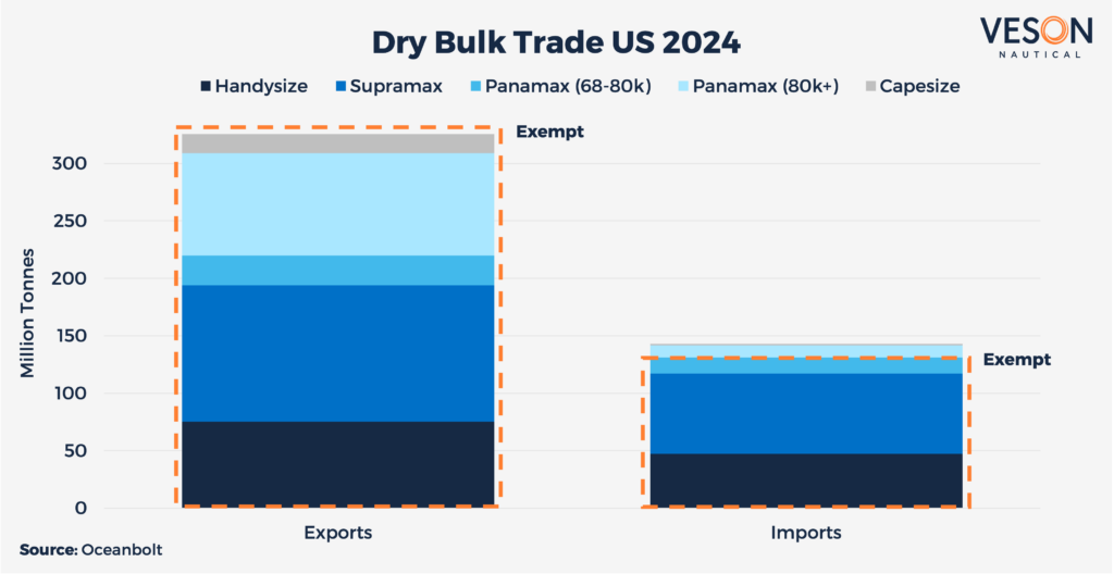 One of the most significant amendments is the exemption of ships arriving in port in ballast condition, i.e., vessels that will load commodities for export. According to Oceanbolt data, the US is a net exporter of dry bulk commodities, exporting more than twice as much as it imports. This means that most Chinese-built dry bulk vessels calling at US ports will not face any port fees, as the majority are used for exports.