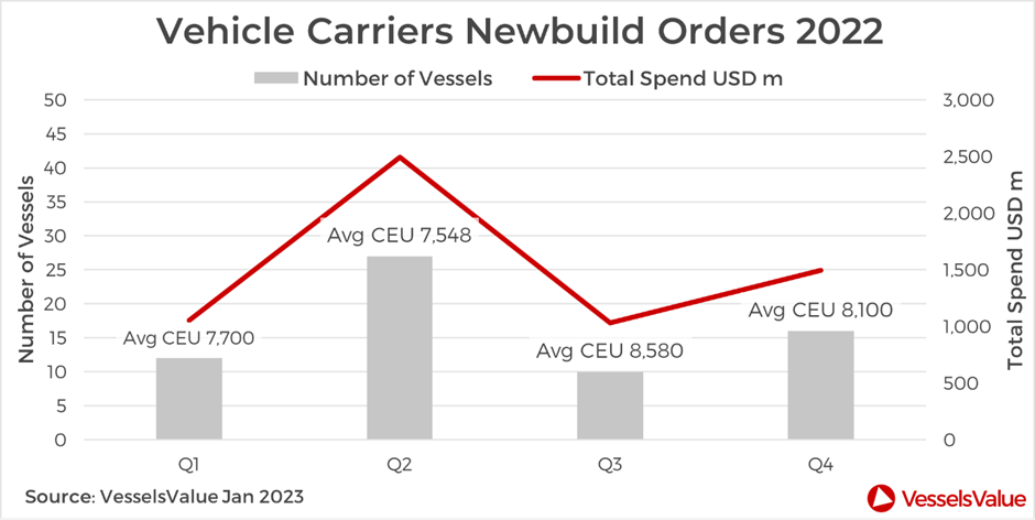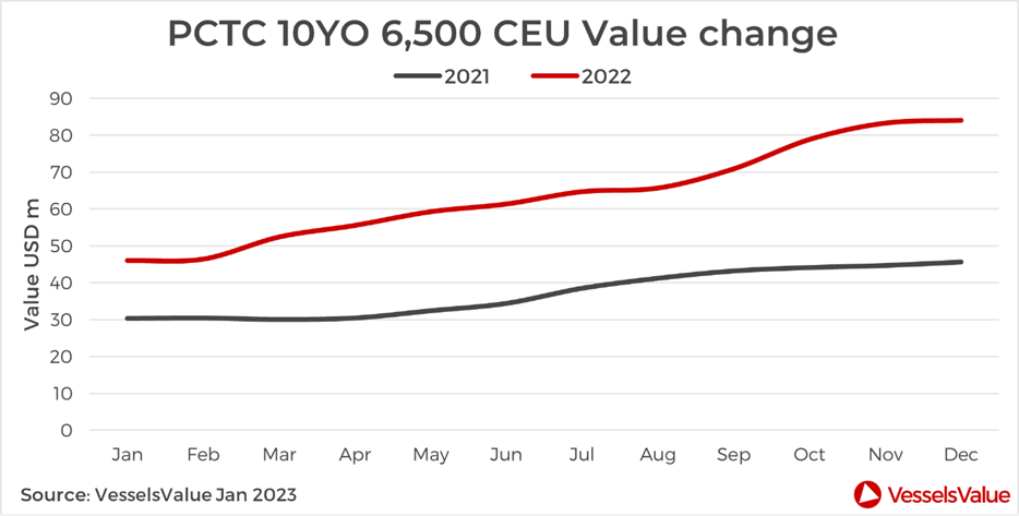 By the year’s end, the VV 1YR 6,500 CEU Time Charter Index had climbed +200% to 103,000 USD/Day. A standard 10 year old 6,500 CEU PCTC increased in value by a whopping +84% to USD 84 mil. 2022 was a record year for rates and values from a genuine super cycle.