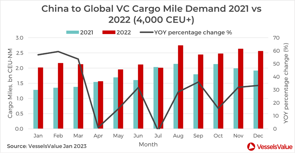 Demand outstripped supply from continued pent up demand, strong EV trade growth from China, and tightening port congestion in Europe slowing ship call frequency.