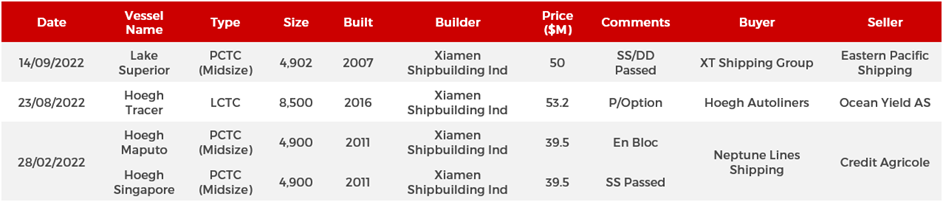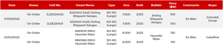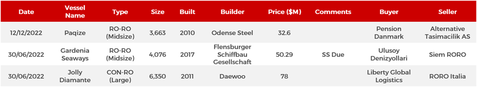 - Shipowners are setting higher asking prices for 5YO and 10YO RoRos in the 2,000 LM and 4,000 LM size range which is positive for values. Further support arrives from OEMs such as Ford switching over to Small RoRos as an alternative to Vehicle Carriers chronically short on supply