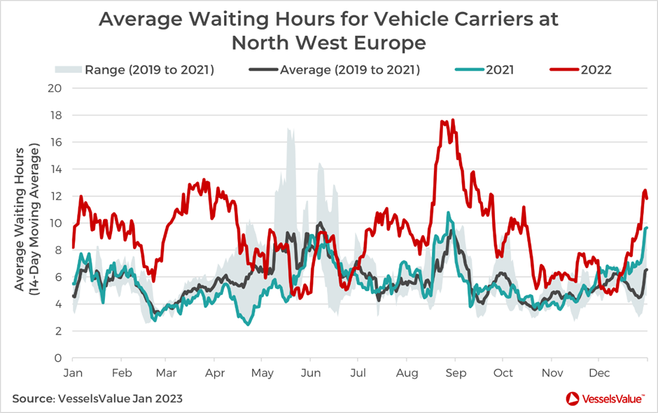 Short Shipping supply got further squeezed for exporters in 2022 due to chronic land side congestion at major ports and terminals in Europe, reducing PCTC (Pure Car Truck Carrier) ship call frequency and therefore capacity. Terminal space completely maxed out in August at major hubs in the Med and Northwest Europe, including Bremerhaven, Zeebrugge and Antwerp, resulting in record delays for Vehicle Carriers on main Transatlantic and Asia to Europe liner services (as shown in Figure 1.1).