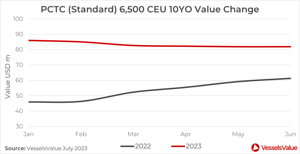 By the end of June, standard PCTC 6,500 CEU 10YO Values had depreciated by 4.7% to USD 82 mil. However, that’s almost 32 mil higher than twelve months previous.