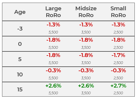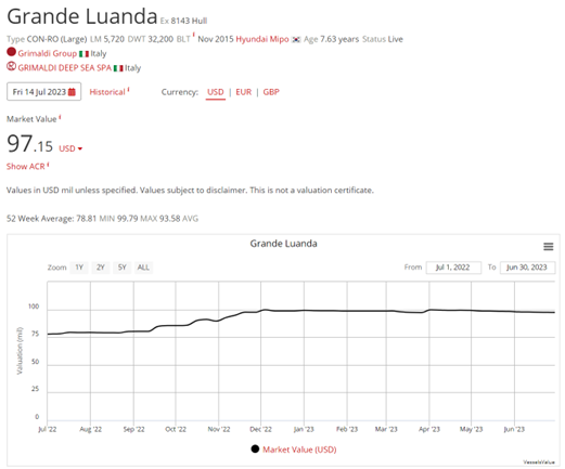 - RoRo values held in 1H 23 across all ages and sizes which is a sign of a balanced to under supplied market, underpinned by strong demand for assets despite lower cargo volumes in Europe.