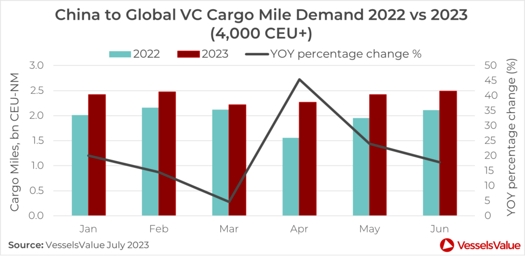 Global cargo miles firmed 2.5% based on 187.7 billon CEU-NM (Car Equivalent Unit per Nautical Mile), confirming strong underlying demand for VCs, but remained 3.5% below pre pandemic levels in 1H 2018 and 1H 2019.