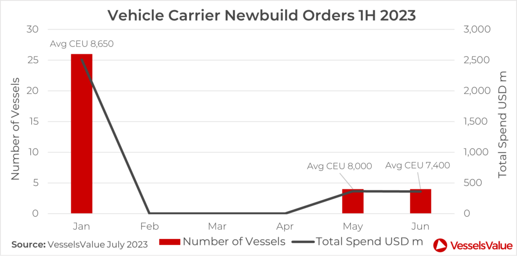 No straight sales of relevance concluded because shipowners could earn more from the charter market capitalising on midterm short supply. VVs 1-Year 6,500 CEU Time Charter Index held stable averaging 105,000 USD/Day, up 110% versus the 1H 2022 average.