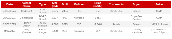 - Sellers CLdN achieved impressive prices for Cadena 3 and Clementine lifting 20/25YO values for 2,500 LM RoRos.