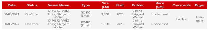 Stena RoRo returned to Jinling Weihai to order a pair of 2,800 LMs rumoured to be USD 65 mil each. A competitive price in today’s high inflation, high labour, and high build cost environment.