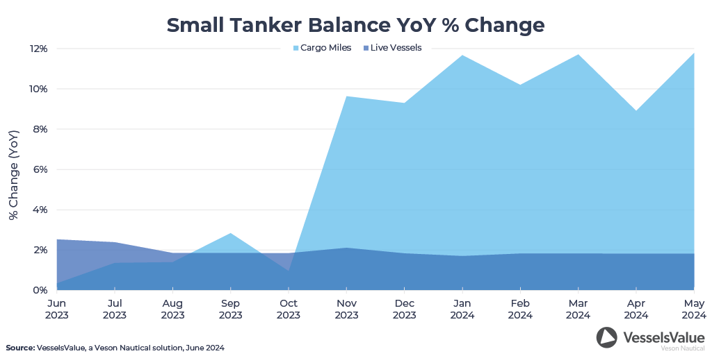 Asset values for Chemical Tankers are approaching historical all-time high levels due to years of underinvestment in the global fleet. According to VesselsValue trade data, cargo miles have averaged c.11% growth YoY since November 2023, whereas vessel supply growth has crawled along at c.2% growth by comparison, leaving a delta of c.9% in favor of demand growth. This imbalance explains why rates and values for Chemical Tanker are so elevated today and are likely to remain this way through to 2026.