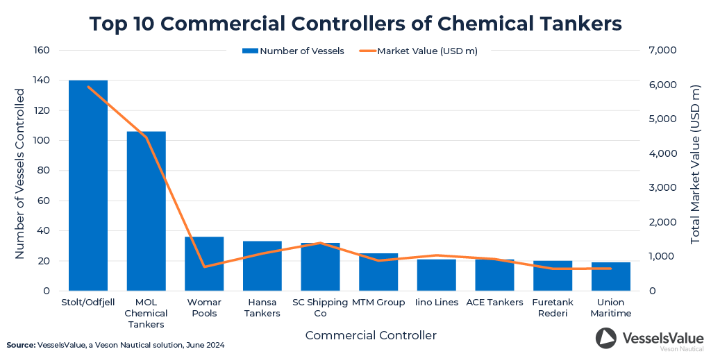 We expect this trend to continue in 2024. MOL completed their USD 400 m acquisition of Fairfield in March, adding 81 multi-segregated chemical carriers to their portfolio, boosting their combined fleet value to USD 1.53 bn according to data from VesselsValue, a Veson Nautical solution. However, what is different this time around is that previous mergers and acquisitions (M&A) occurred in challenging market conditions, when smaller owners were struggling to stay afloat, and asset prices looked attractive. The opposite is true today, which makes the current round of takeover negotiations even more compelling.